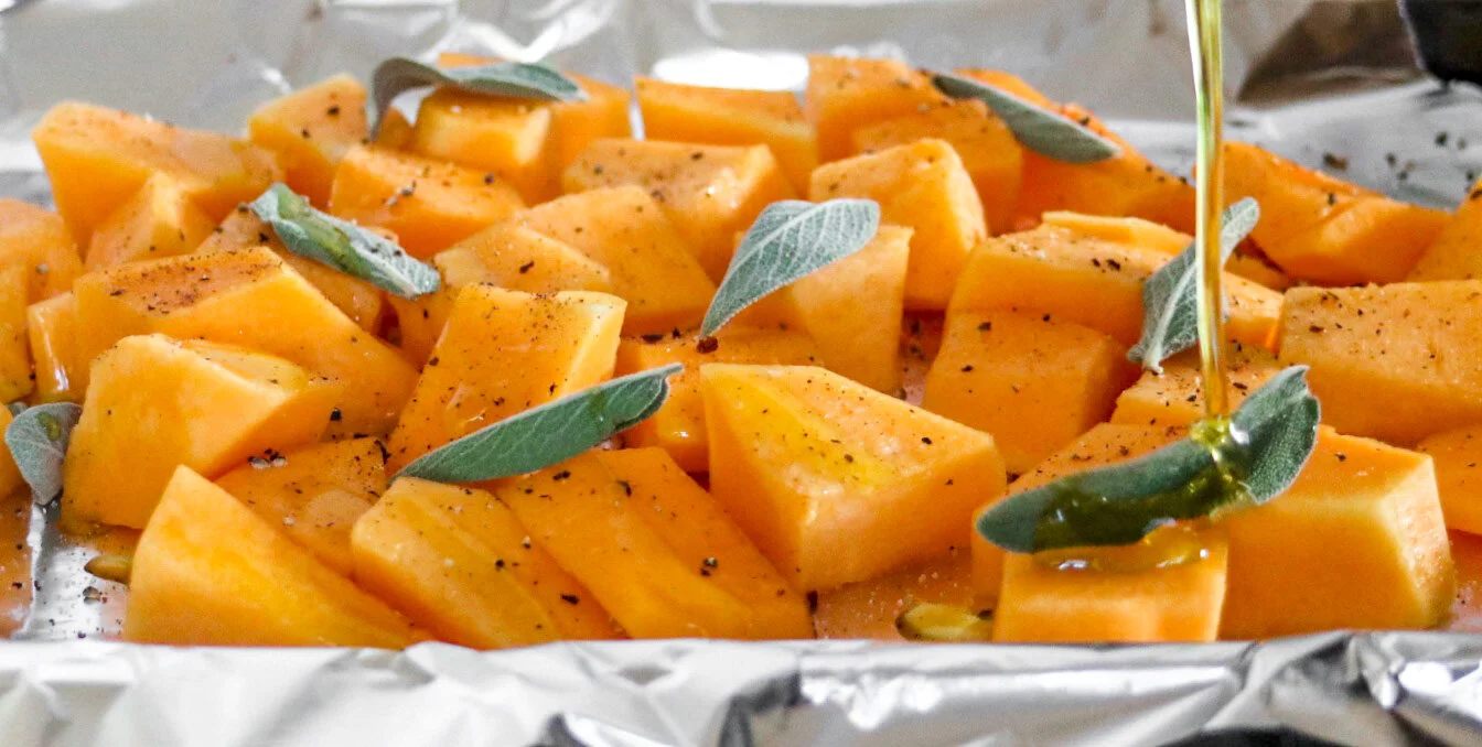 - Toss butternut squash and sage leaves with olive oil (just enough to coat) and sprinkle with salt, pepper, and nutmeg. Place on foil lined baking sheet.
