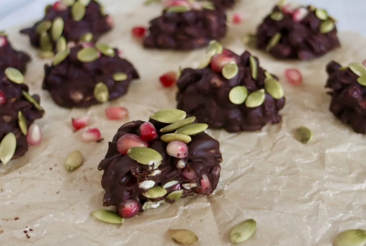 Dry off the pomegranate seeds. Melt the chocolate. Then, mix in the pomegranate and pistachios until coated. Scoop out 1-1 1/2 inch balls and place onto parchment paper. Then, let the chocolate set (You can speed this up by placing in the fridge). That’s it!