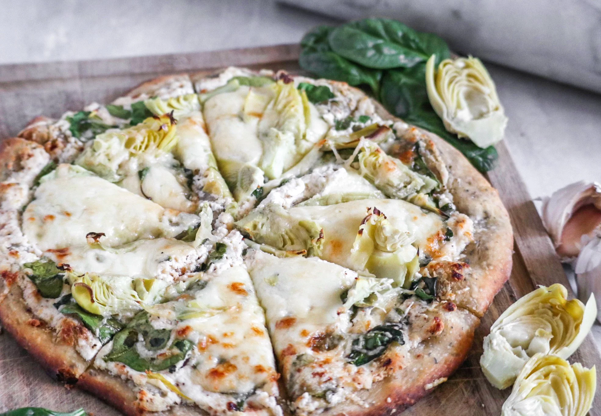 This cheesy, delicious, spinach artichoke pizza is easy to make and packed with ricotta, mozzarella, parmesan, spinach, and artichoke hearts!