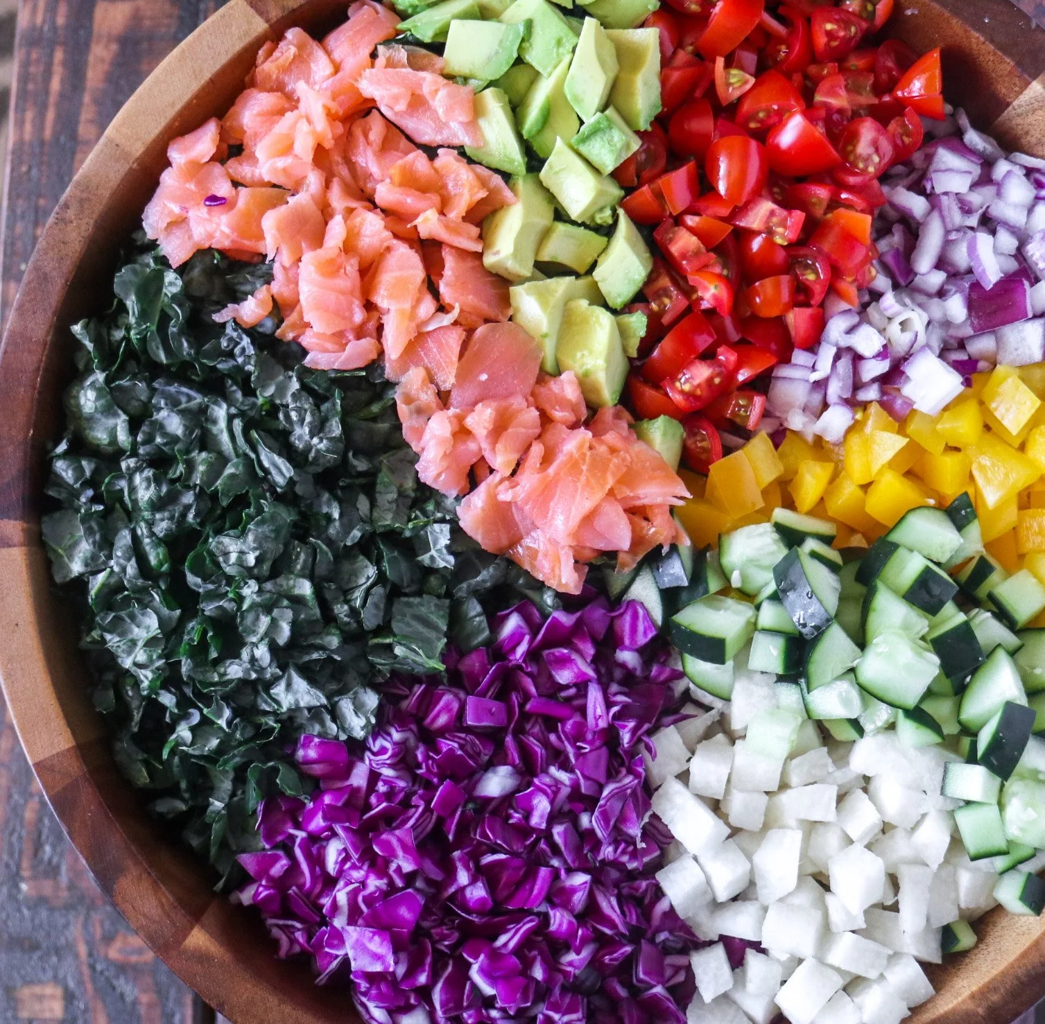 A chopped salad like no other! Packed with vegetables, smoked salmon, and tossed in a delicious creamy tahini dressing, you’ll make it again and again!